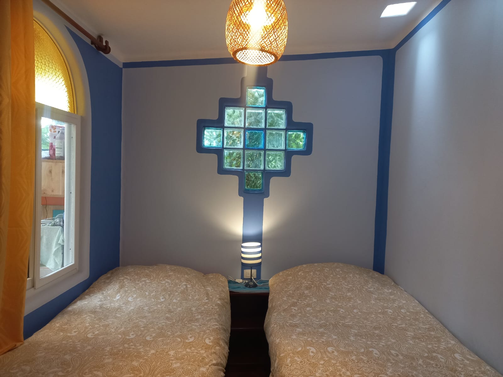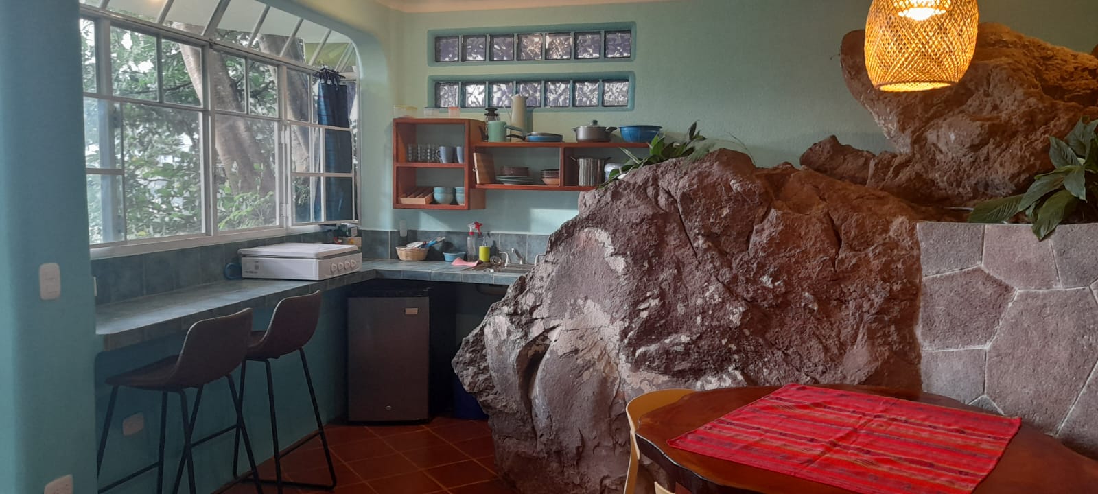 Cette petite chambre très économique, avec sa fenêtre semi‑circulaire, donne l’impression de faire partie du paysage naturel qui l’entoure.Idéale pour l’étude ou une retraite personnelle, elle donne accès à une kitchenette, à des salles de bain et à une pergola communes.